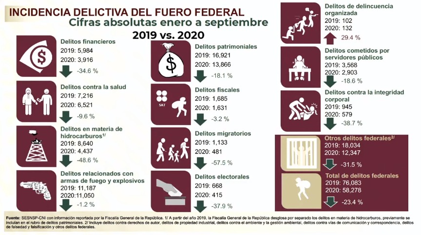 En lo que corresponde a la incidencia delictiva del fuero federal, es decir, los delitos que son responsabilidad exclusiva del Gobierno Federal, salvo la delincuencia organizada, todos mostraron un registro menor en enero a septiembre de 2020, si se compara con el mismo periodo del año anterior.