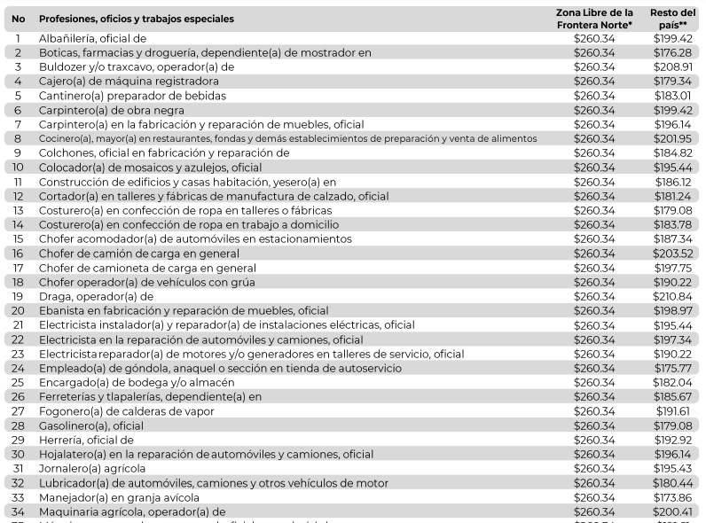 - Zona Libre de la Frontera Norte: 260.34 pesos diarios; y,