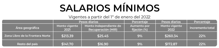 El 8 de diciembre de 2021 se publicó en el Diario Oficial de la Federación (DOF) la Resolución del Consejo de Representantes de la Comisión Nacional de los Salarios Mínimos (CONASAMI) mediante la cual se establecieron los salarios mínimos para el año 2022.